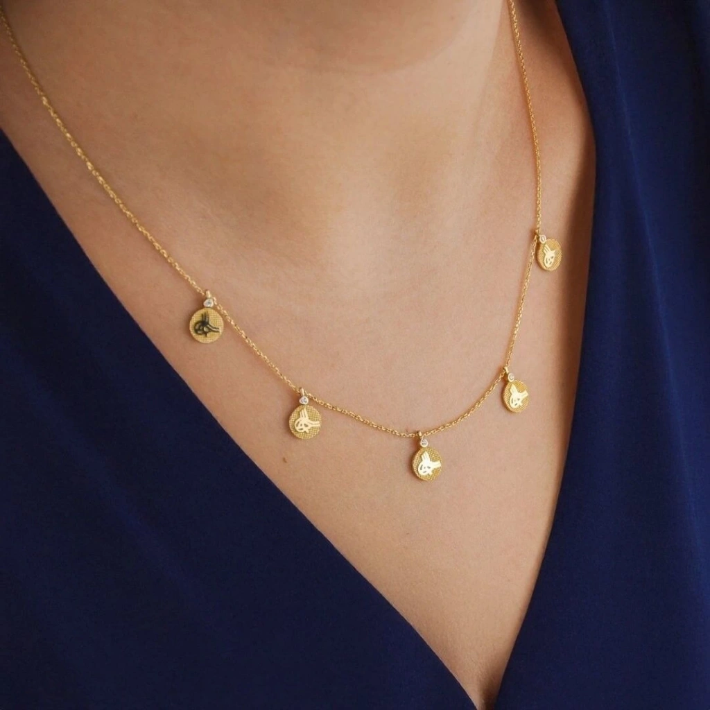 Evla Kuyumculuk'un özgün ve zarif tasarımlarından biri olan 14 Ayar Altın Beşli Tuğra Kolye, büyüleyici bir görünüm ve anlam dolu bir tasarıma sahiptir. Bu özel kolye, 3,20 gram ağırlığındaki 14 ayar altınla özenle işlenmiştir. Kolyenin beşli tuğra motifli tasarımı, zarafeti ve tarihi bir dokunuşu bir araya getirirken, altının parlaklığı da dikkat çekici bir şekilde öne çıkar. Evla Kuyumculuk, bu kolyeyi özgün bir stil ile tasarlamış ve her ayrıntısına özen göstermiştir.