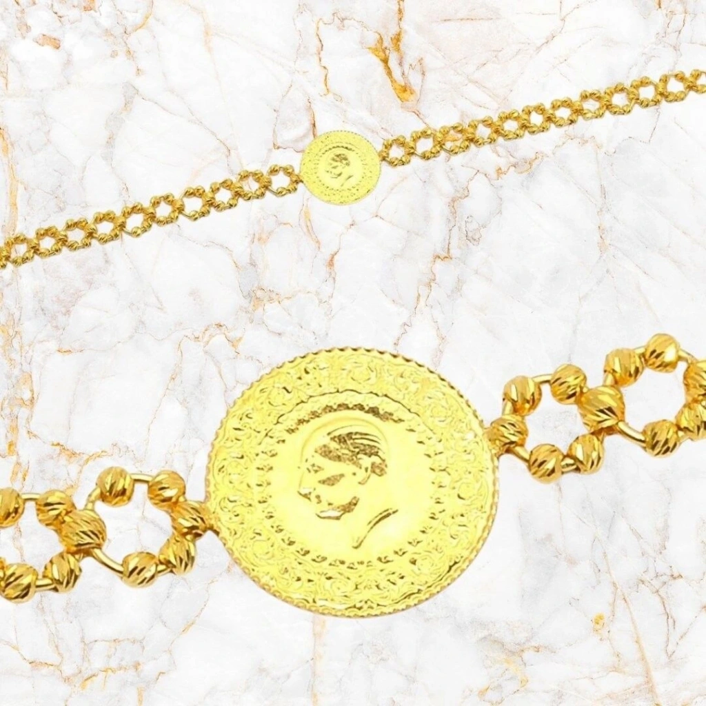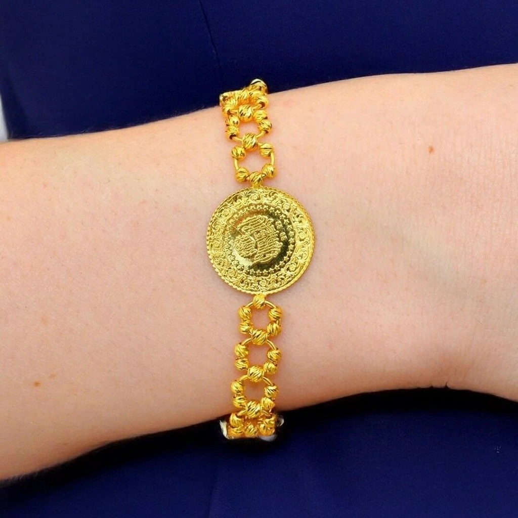Evla Kuyumculuk'un özel tasarımı olan 14 Ayar Altın Çeyrekli Bileklik, zarif ve şık bir takı parçasıdır. Bu bileklik, yüksek kaliteli 14 ayar altından üretilmiş olup, klasik ve etkileyici bir görünüm sunar. Bilekliğin ana özelliği, 9,48 gram ağırlığındaki altın çeyrek dahilidir. Altın çeyrek, bilekliğe değerli bir detay katar ve çekiciliğini vurgular. Bu detay, bilekliğin özgün ve dikkat çekici bir parçasıdır.