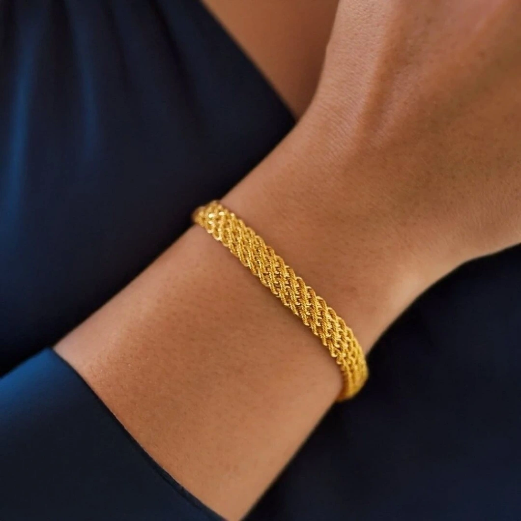 Bileklik, 19 cm uzunluğundadır ve halat örgü şeklindedir. Evla Kuyumculuk garant belgesi ve sertifikası ile güvenli ödeme sistemli satış. Altın Kalze,Hasır Set Takımı modellerimize şimdi göz atma zamanı.
