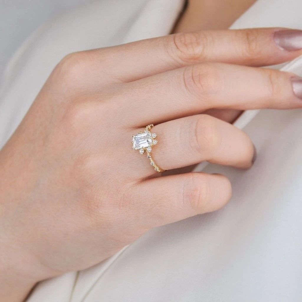 14 Ayar Altın Lotus Baget Yüzük, zarif lotus çiçeği motifi ile birleşen şık baget kesim taşlarıyla göz alıcı bir tasarım sunar. 2,40 gram ağırlığında olan bu yüzük, minimalizm ve anlam derinliği arayanlar için mükemmel bir tercih. Lotus çiçeği, saflığı ve yeniden doğuşu simgelerken, baget kesim taşlar ise yüzüğe zarif bir parlaklık katıyor.