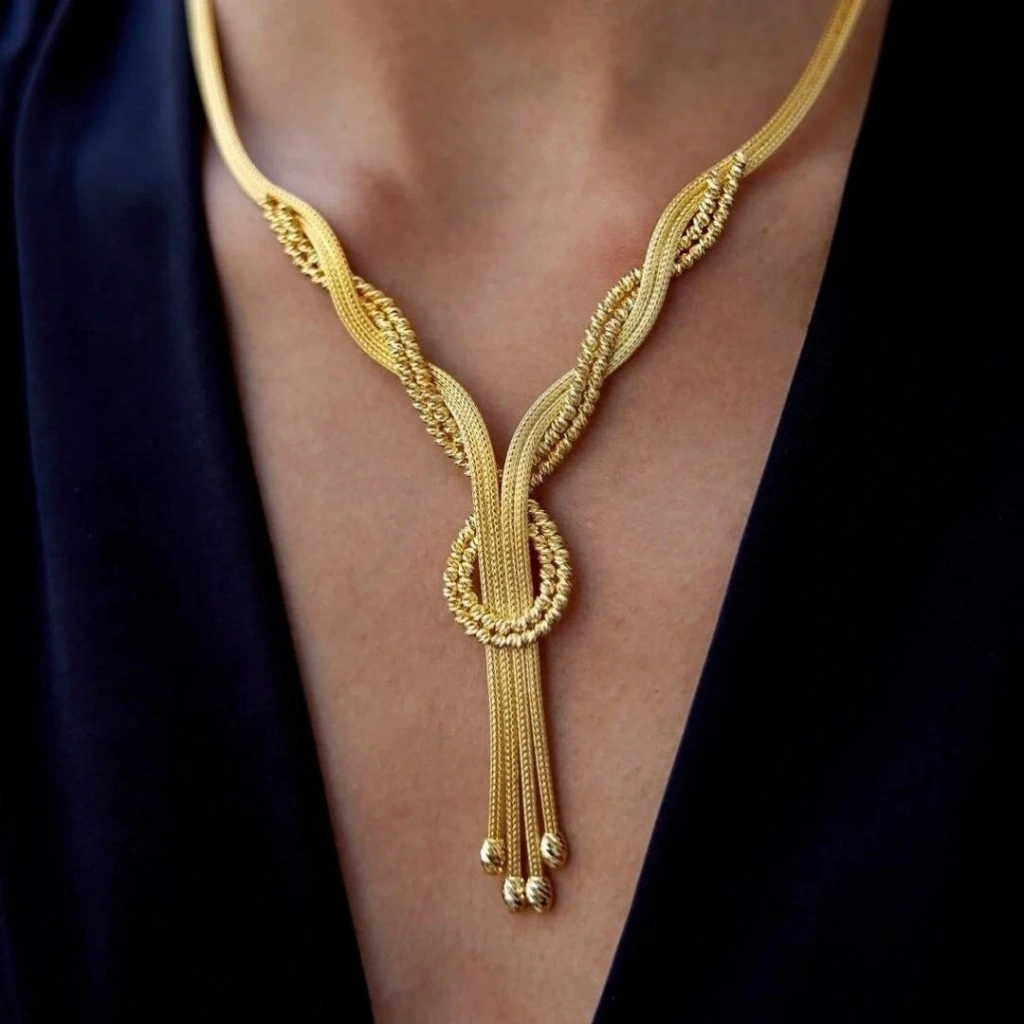 Kolye, 45 cm uzunluğundadır ve mesh örgü şeklindedir.