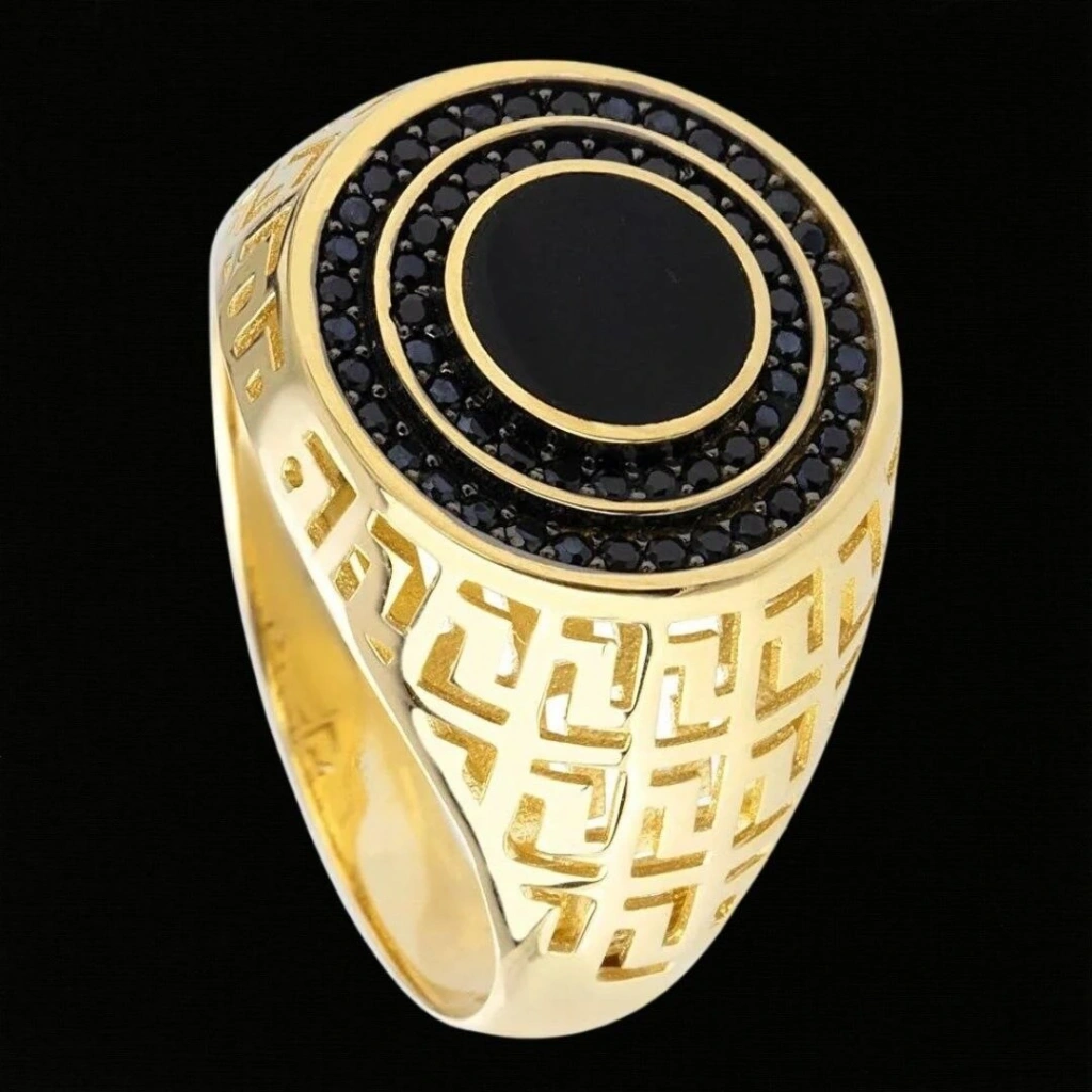 Yüzüğün ön yüzünde, oval şekilde kesilmiş pürüzsüz ve parlak bir siyah oniks taşı yer almaktadır. Siyah oniks taşı, yüzüğe klasik ve zarif bir görünüm kazandırmaktadır. Taşın etrafı, altın bir çerçeve ile çevrilidir. Bu çerçeve, taşa ekstra bir ışıltı ve değer katar. Yüzüğün yanları ve iç kısmı pürüzsüz bir şekilde cilalanmıştır. Bu da yüzüğü takmayı oldukça konforlu hale getirir.