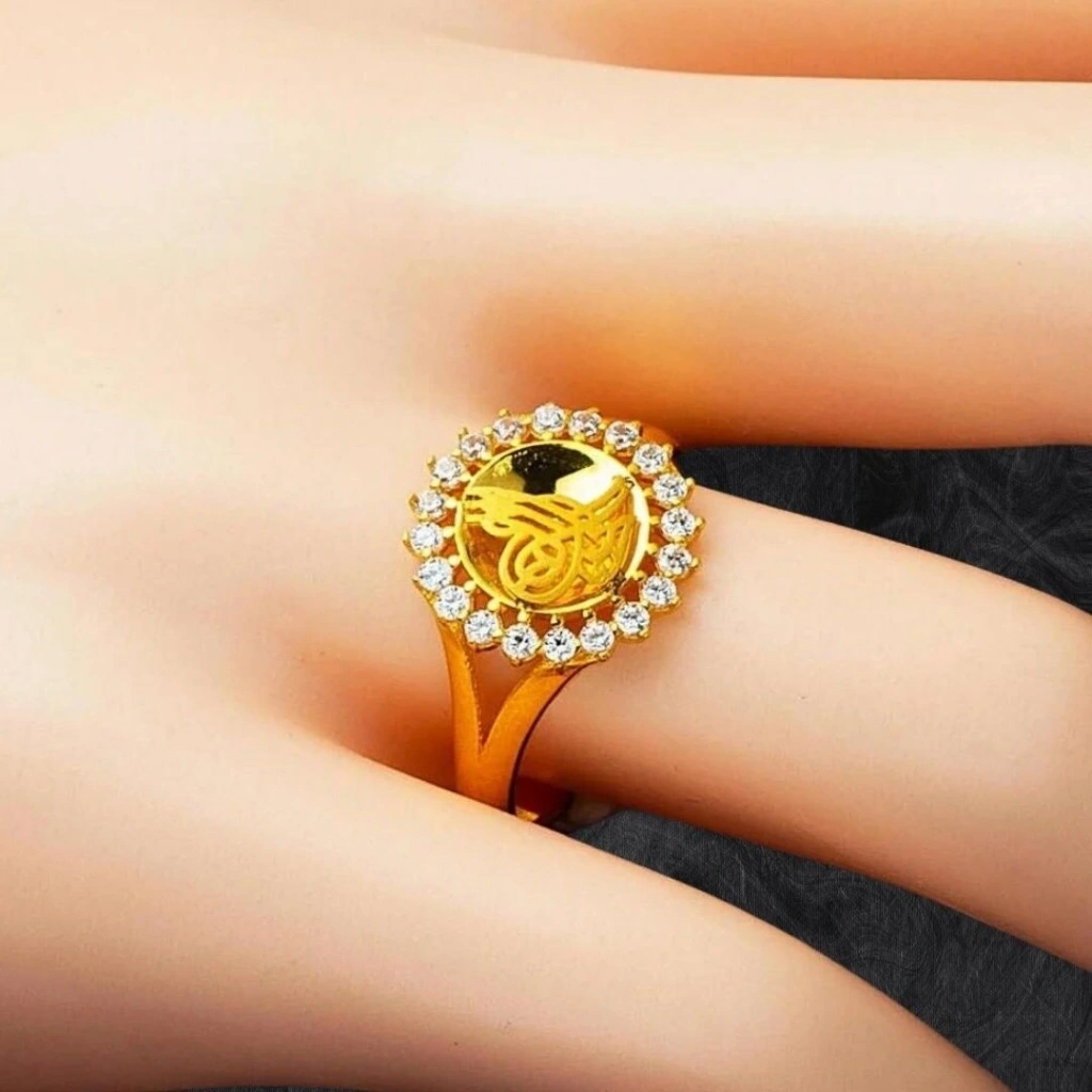 14 Ayar Güneş Tuğra Altın Yüzük, geleneksel Osmanlı tuğrası ve güneş motiflerinin birleşimiyle şıklığınızı tamamlayacak zarif bir parça sunar. 2,24 gram ağırlığındaki bu yüzük, sarı altının doğal ışıltısını yansıtarak her parmakta etkileyici bir duruş sergiler. Tuğra motifi, tarihin derinliklerinden gelen zarafeti modern bir tasarımla birleştirir.