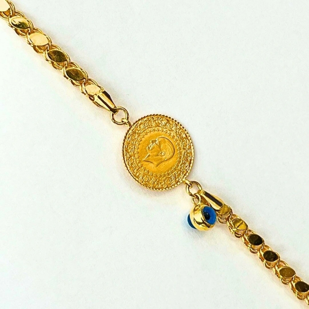 Bu 14 ayar altından yapılmış pullu çeyrekli bileklik . Zarif detayları ve şık tasarımıyla öne çıkan, değerli bir takıdır. 6,30 gram ağırlığındaki bu bileklik . Üzerindeki çeyrek altın ve zarif pullarıyla hem göz alıcı hem de anlamlı bir aksesuar sunar. Pullu tasarım, bilekliğe hareketli ve dinamik bir görünüm kazandırırken, çeyrek altın bileziğin klasik ve geleneksel değerini arttırır.