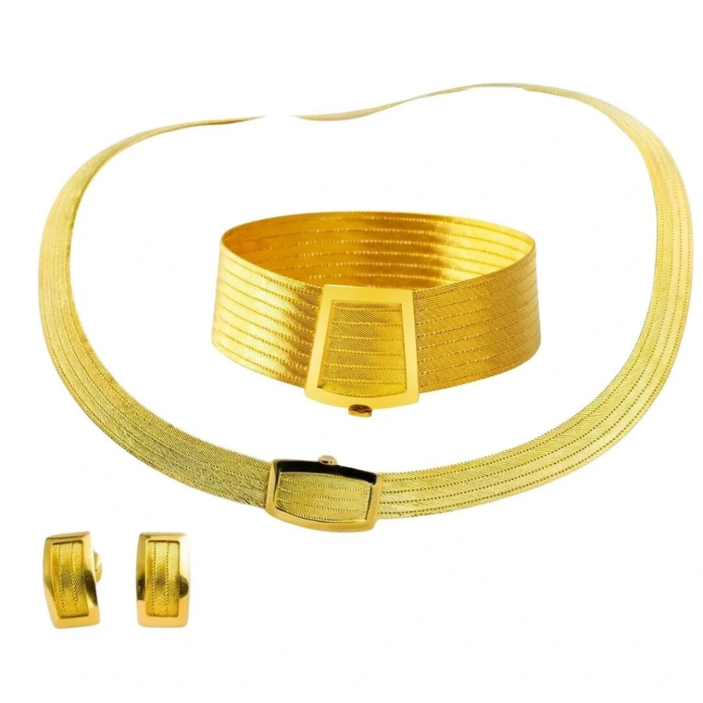 Evla Kuyumculuk,zarafeti ve estetiği bir araya getiren 8 Ayar Altın Sade 9 Sıra Trabzon Hasır Set Takımı ile öne çıkan bir seçenek sunmaktadır. Bu özel takım,  yüksek kaliteli 8 ayar altın kullanılaraközenle üretilmiştir. Takımın temel parçaları, Trabzon hasırı deseniyle süslenmiştir ve altın zincirlerdenoluşmaktadır. Trabzon hasırı,  özel birörgü tekniği kullanılarak el işçiliğiyle oluşturulan bir desendir. Bu desen,takıya benzersiz bir dokunuş ve zarafet katmaktadır. Her bir parça,  ustalar tarafından özenle işlenmiş ve detaylandırılmıştır,böylece takımın sadeliği ve şıklığı ön plana çıkarılmıştır.  54,87 gram.