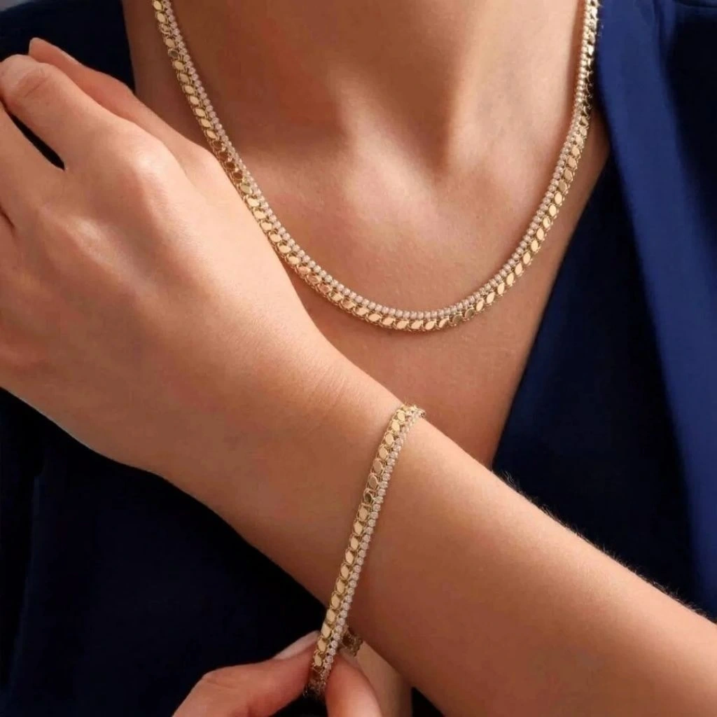 Altın Pullu Suyolu Set Takımı, su yolu tasarımının klasik zarafetini parlak pullarla süsleyerek modern ve şık bir görünüm sunar. Set içerisindeki kolye ve bileklik, uyumlu tasarımıyla kombinlerinizi tamamlar ve hem günlük kullanım hem de özel günler için mükemmel bir seçenektir.