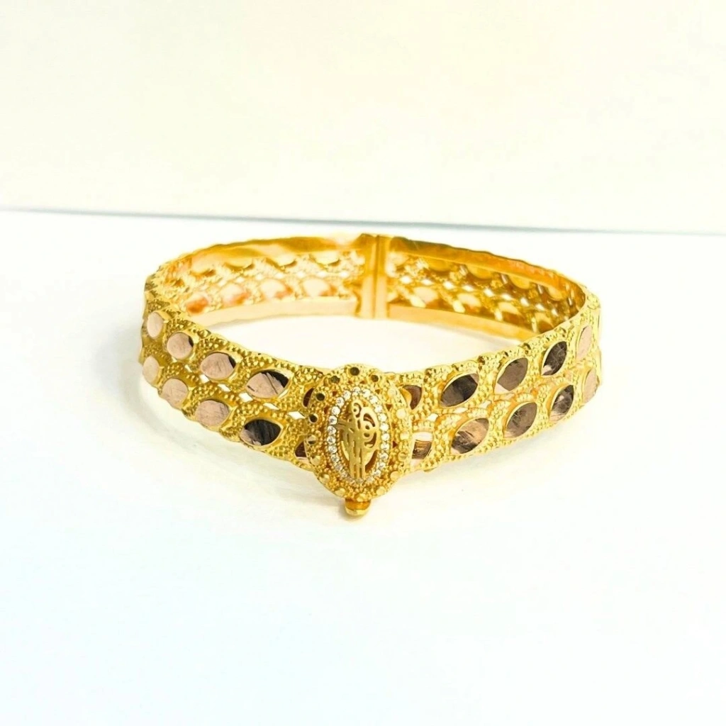 Bu 8 ayar sarı altın 2 sıra pullu tuğra kelepçe, zarif ve şık bir tasarıma sahiptir. Pullu detayları ve tuğra motifi, bilekliğe geleneksel bir hava katarak dikkat çekici bir aksesuar sunar.