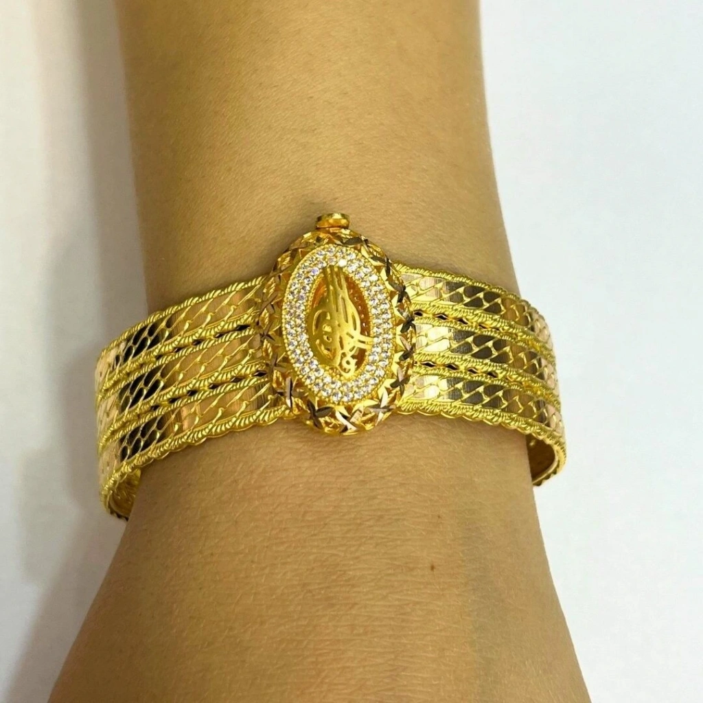 Bu 8 ayar sarı altın 3 sıra burmalı kelepçe, modern ve şık bir tasarıma sahiptir. Burmalı detaylarıyla zarif bir görünüm sunarak, her türlü kıyafetle uyum sağlar.
